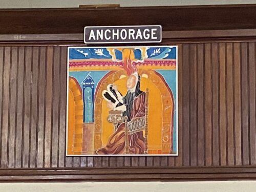 Regardless of how Hildegard may have functioned (or not) as an anchorite, we have assigned the name, “anchorage” to our icon prayer loft because it is a space where one can retreat from the world for a few hours in personal meditation and prayer. It seemed the perfect spot to hang Sr. Kathleen’s silk portrait of Hildegard inviting one to a time of solitude.