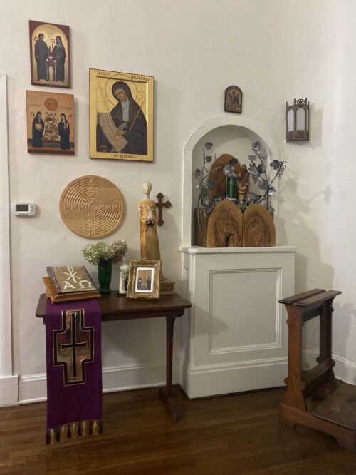 This icon of St. Hildegard was commissioned for our space in 2017 by an anonymous donor. It took over a year to be completed by Marek Czarnecki, an iconographer in Connecticut. The piece depicts St. Hildegard with her traditional symbols of staff/crozier (a symbol of her authority as a magistra or leader in her community), a ray of Living Light illuminating her text, and a feather. The text on the scroll was selected by our founding pastor and is the opening line to the antiphon, Karitas habundat in omnia (translated, Love abounds in all things).
