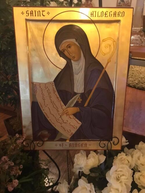 St. Hildegard of Bingen is our patron saint. It is most appropriate that this icon of our patron is prominently displayed in our sanctuary. The building was founded originally as a Byzantine Catholic Church, therefore, icons are a part of its history.